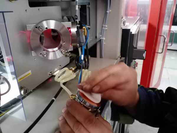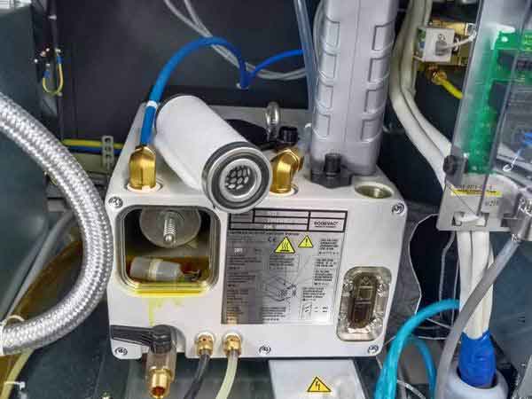 8. Производим центровку сопла и производим тестовый рез детали, затем устанавливаем на место крышки резонатора. Обслуживание станка завершено.