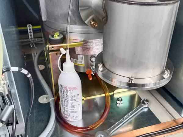 3. Сливаем масло с вакуумного насоса, откручиваем крышку и достаем фильтр-сепаратор. Меняем фильтр-сепаратор, не забывая установить его швом вниз, и закрываем крышку. Заливаем масло в вакуумный насос до необходимого уровня.